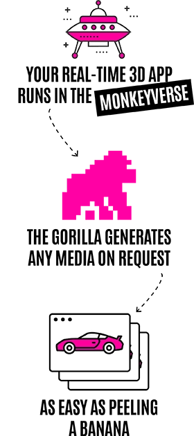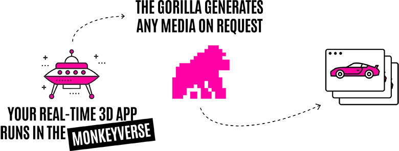 GORILLA RENDERING converts 3D scenes into 2D images and videos in real-time, generating assets only upon user request to optimize performance and storage.